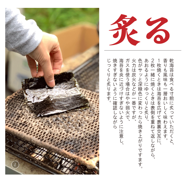 おにぎり・手巻き寿司はもちろん、焼いた時の香りは格別で、海苔好きの方に高く評価される品です。